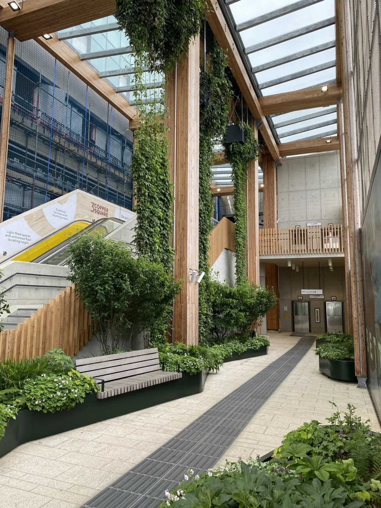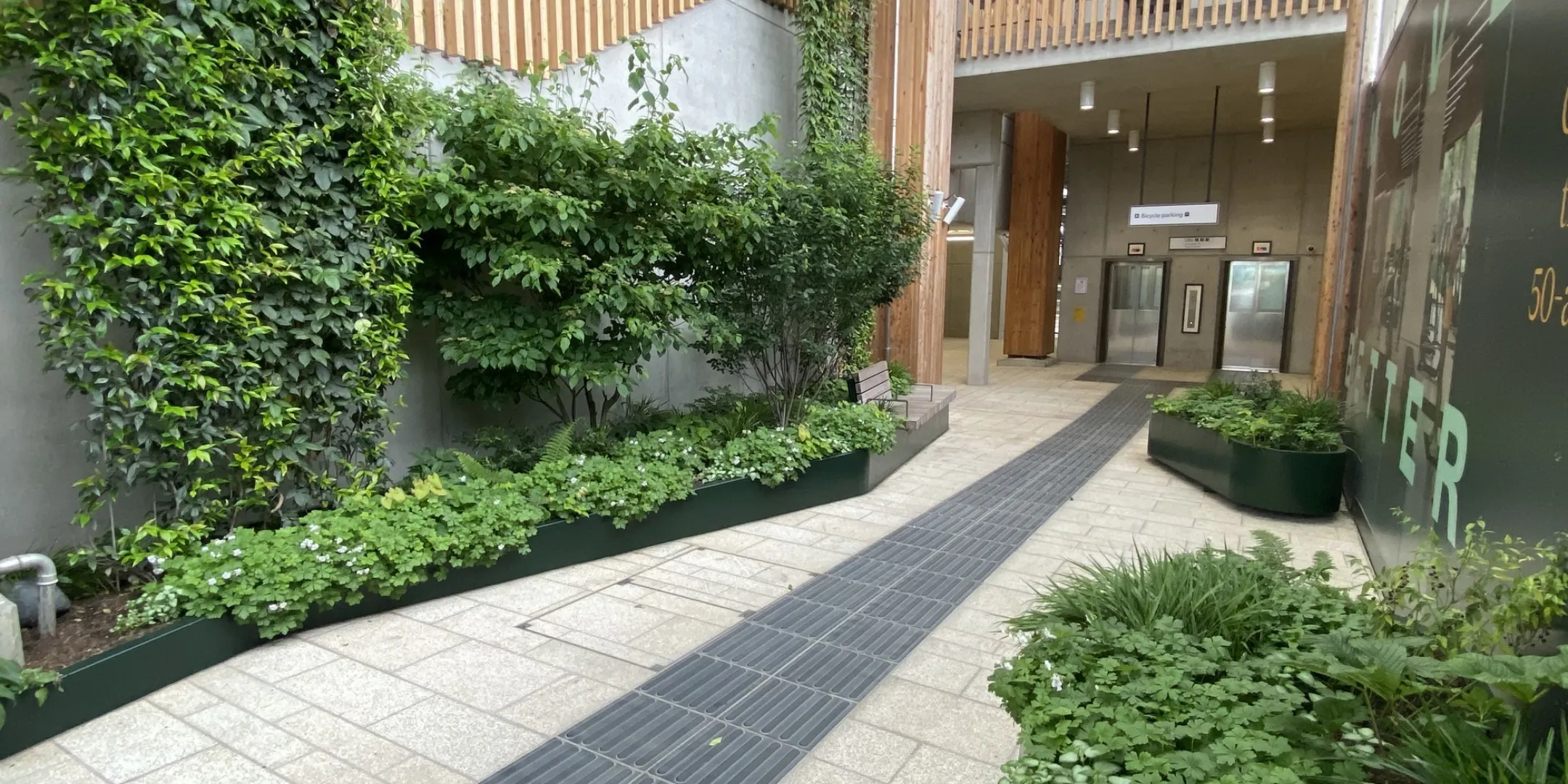 Over 100m² of vertical greening, 55m² of ground-level planting, and four feature trees, including a striking Ginkgo biloba, bring year-round foliage and vibrant seasonal interest to the station’s arrival experience.
