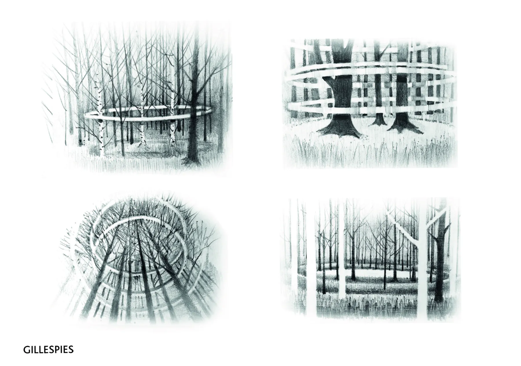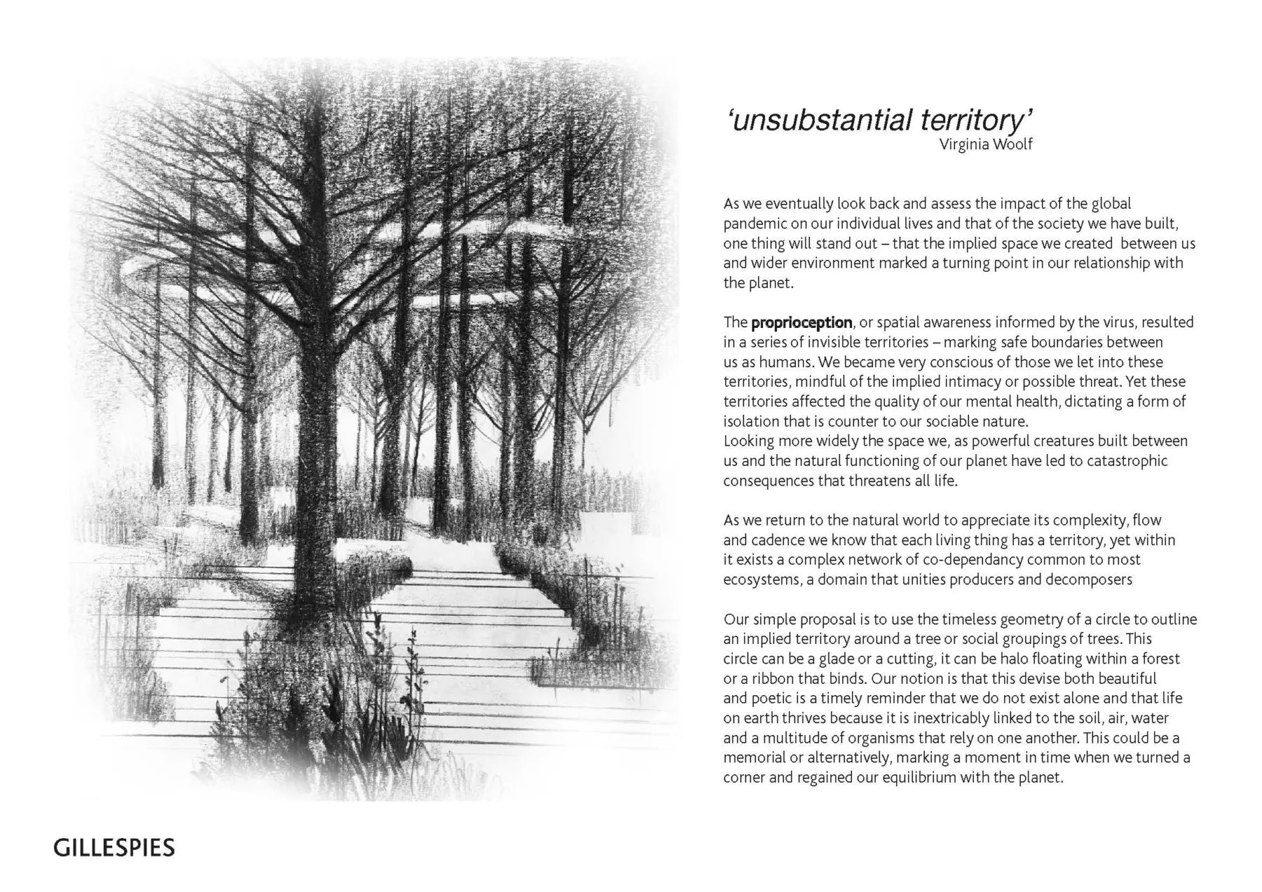 ‘Our simple proposal is to use the timeless geometry of a circle to outline an implied territory around a tree or social groupings of trees. This circle can be a glade or a cutting, it can be a halo floating within a forest or a ribbon that binds. Our notion is that this device, both beautiful and poetic, is a timely reminder that we do not exist alone and that life on earth thrives because it is inextricably linked to the soil, air, water and a multitude of organisms that rely on one another. This could be a memorial or alternatively, marking a moment in time when we turned a corner and regained our equilibrium with the planet.’