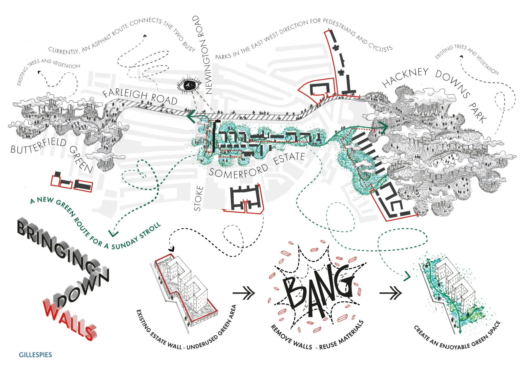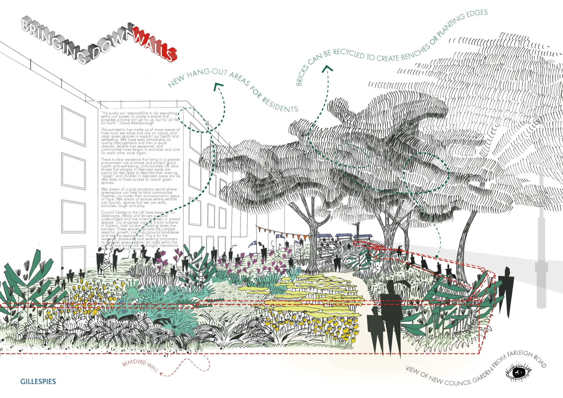 ‘Council Estates in the UK have been left to deteriorate. Walls and fences surround underutilised and low amenity green or paved spaces. Our proposal creates a pilot scheme in Dalston, East London; breaking down the barriers. These spaces become the catalyst seed for growth, creating colourful biodiverse and healthy experiences. This is for the residents, passers-by and walking commuters to discover green respite; an oasis within the city to have incidental meaningful interactions with people and nature.’