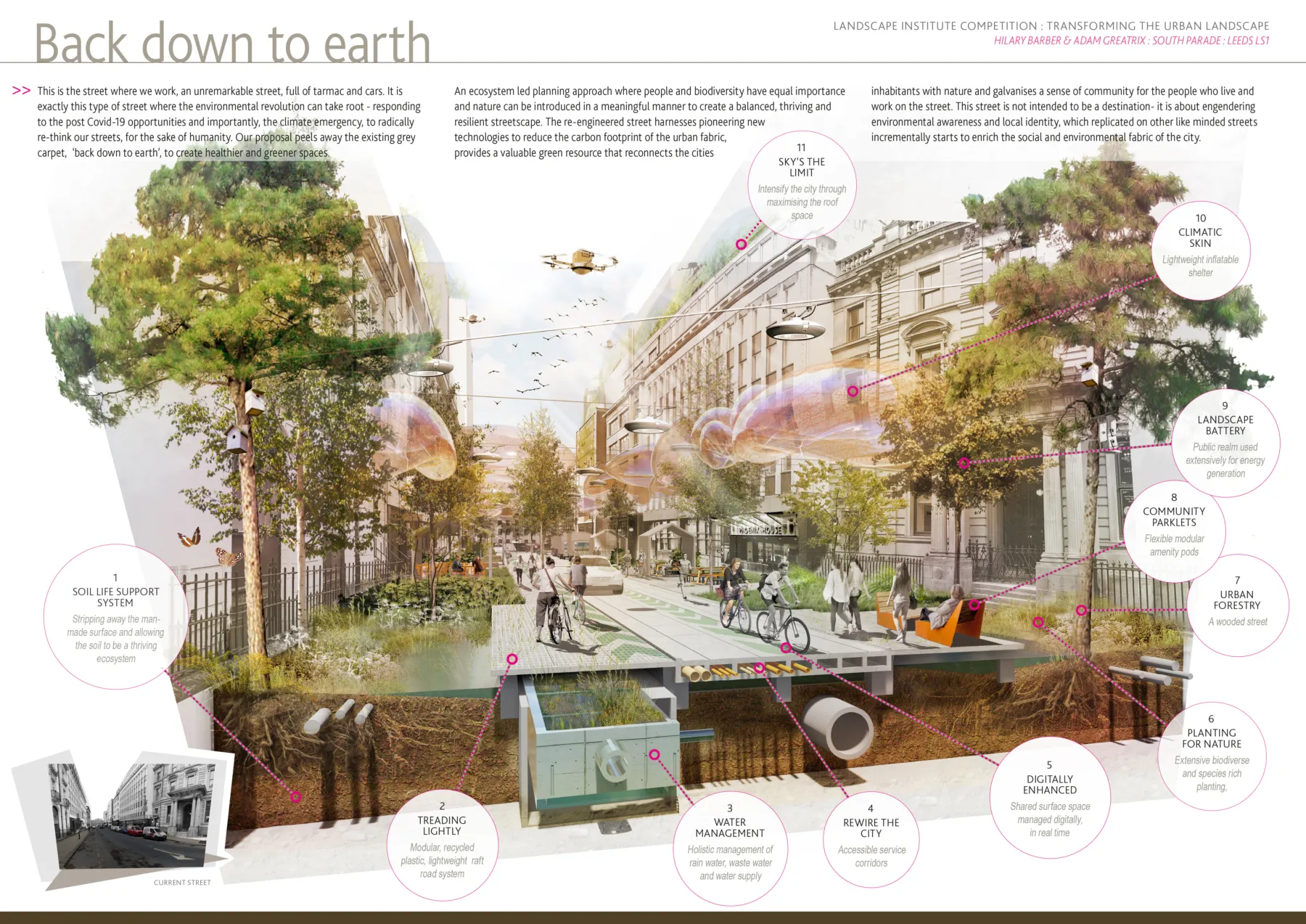 ‘This project is dedicated to all the unremarkable side streets where there is real potential to radically rethink, and pioneer an environmental revolution, responding to the post-Covid-19 opportunities and critically, the climate emergency for the sake of all humanity, these streets could incrementally start to enrich the social and environmental fabric of our cities. Peeling away the existing grey carpet, ‘back down to earth', to promote an ecosystem led approach where people and biodiversity have equal importance to create a balanced, thriving and resilient streetscape for people and nature.’
